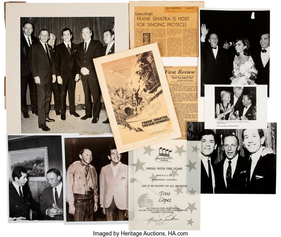Frank Sinatra Signed and Inscribed Handbill With Photos and Articles. Ten pieces (in various sizes) with ties to Frank Sinatra, including a promo booklet signed and inscribed by Ol' Blue Eyes. Includes: 1)A 7 ¼" x 10 ¾" promo booklet for Von Ryan's Express, signed and inscribed "Swing / Trini! / Frank Sinatra / June 23/65" with a blue ballpoint pen. In Very Good condition with soiling and toning throughout; 2)A news clipping from the Los Angeles Herald-Examiner(dated Feb. 5, 1967) for a party Sinatra hosted. Heavily toned. In Very Good condition; 3)A news clipping titled "Sinatra's First Review" held in a matte. Heavily toned and Very Good condition; 4)A promo about the Frank Sinatra Celebrity Invitational on March 4-6, 1993. Printed on mesh-like paper. In Near Mint condition; 5)Four black and white photos of Trini and Frank, along with a promo pic of Frank with Marilyn Monroe. Overall, in Very Good condition with some creasing and a tear one photo with Frank; 6)A large print of Trini with Frank and Hubert Humphrey, matted. In Very Good condition with creasing through the left side. COA from Heritage Auctions.