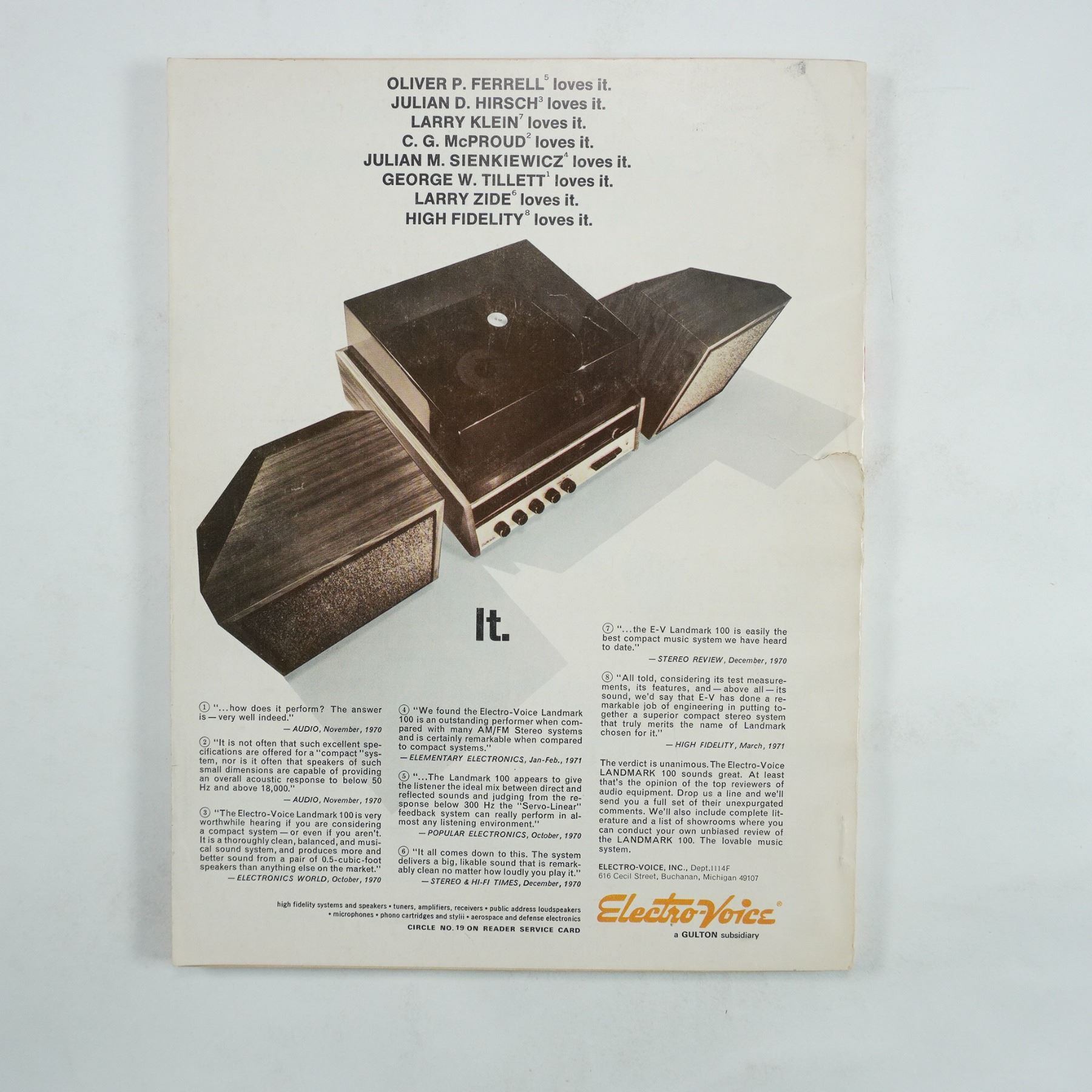 A vintage issue of Stereo Review magazine from November 1971, featuring Frank Sinatra on the cover. The cover illustration presents a striking artistic rendering of Sinatra's face with a rainbow motif, reflecting the era's bold design style. Inside, the magazine includes articles and photographs detailing Sinatra's career and influence on music. Stereo Review was a premier publication for audiophiles, offering insights into high-fidelity sound, equipment reviews, and interviews with major artists of the time. A nostalgic collectible for fans of Sinatra and vintage music journalism.