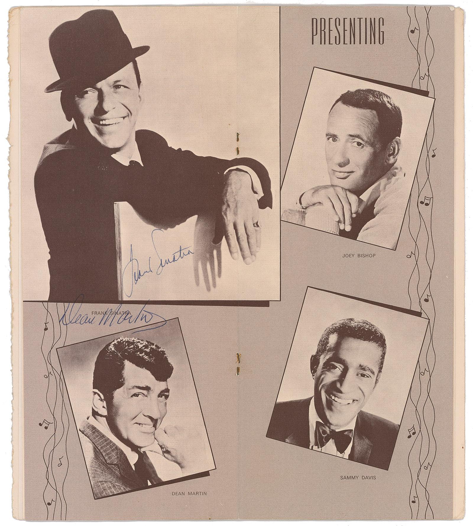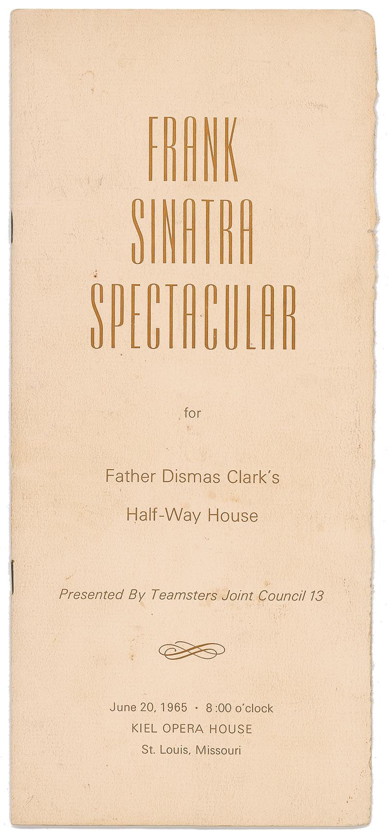 Vintage program from the Frank Sinatra Spectacular for Father Dismas Clark’s Half-Way House, 5.5 x 12.5, held at the Kiel Opera House in St. Louis, Missouri, on June 20, 1965. Signed inside in blue ballpoint on their respective images by Frank Sinatra and Dean Martin. In fine condition, with some light handling wear and soiling to covers. Pre-certified PSA/DNA and RRAuction COA.