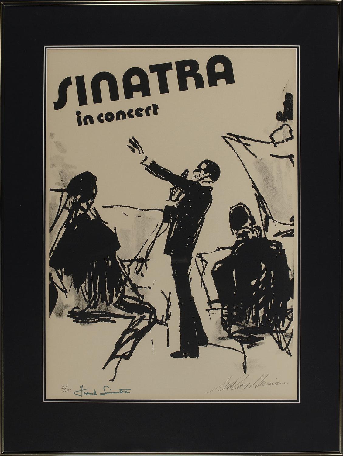 Exceptional limited edition 17.5 x 25.5 litho entitled “Sinatra In Concert,” numbered #71/300, signed in the lower left corner in felt tip by Sinatra. Also signed in pencil by the artist, LeRoy Neiman. Double matted and framed to an overall size of 24 x 32. In fine condition. "Sinatra In Concert" was one of Neiman's earliest limited edition signed lithographs. Scarce signed by just Neiman alone, the addition of Sinatra’s signature elevates this piece to a very limited and desirable quantity. Oversized.