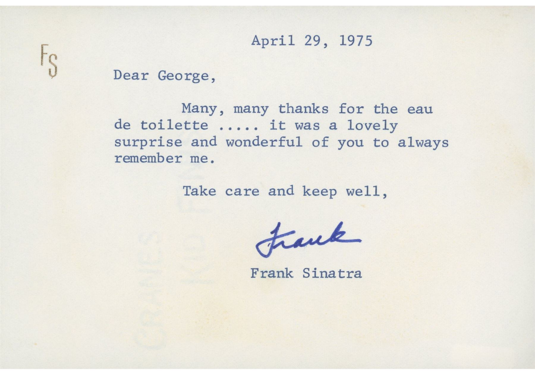 Frank Sinatra signed note on personal stationery dated April 29, 1975