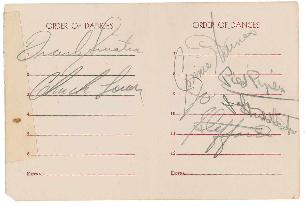 Dance card, measuring 5.75 x 4, with music provided by Tommy Dorsey and his Band, signed inside in pencil on the first line by Sinatra. Card also bears five other signatures in pencil as well. Tape along left edge of signed page, lightly touching first letter of signature, some mild toning, and light handling wear, otherwise fine condition.