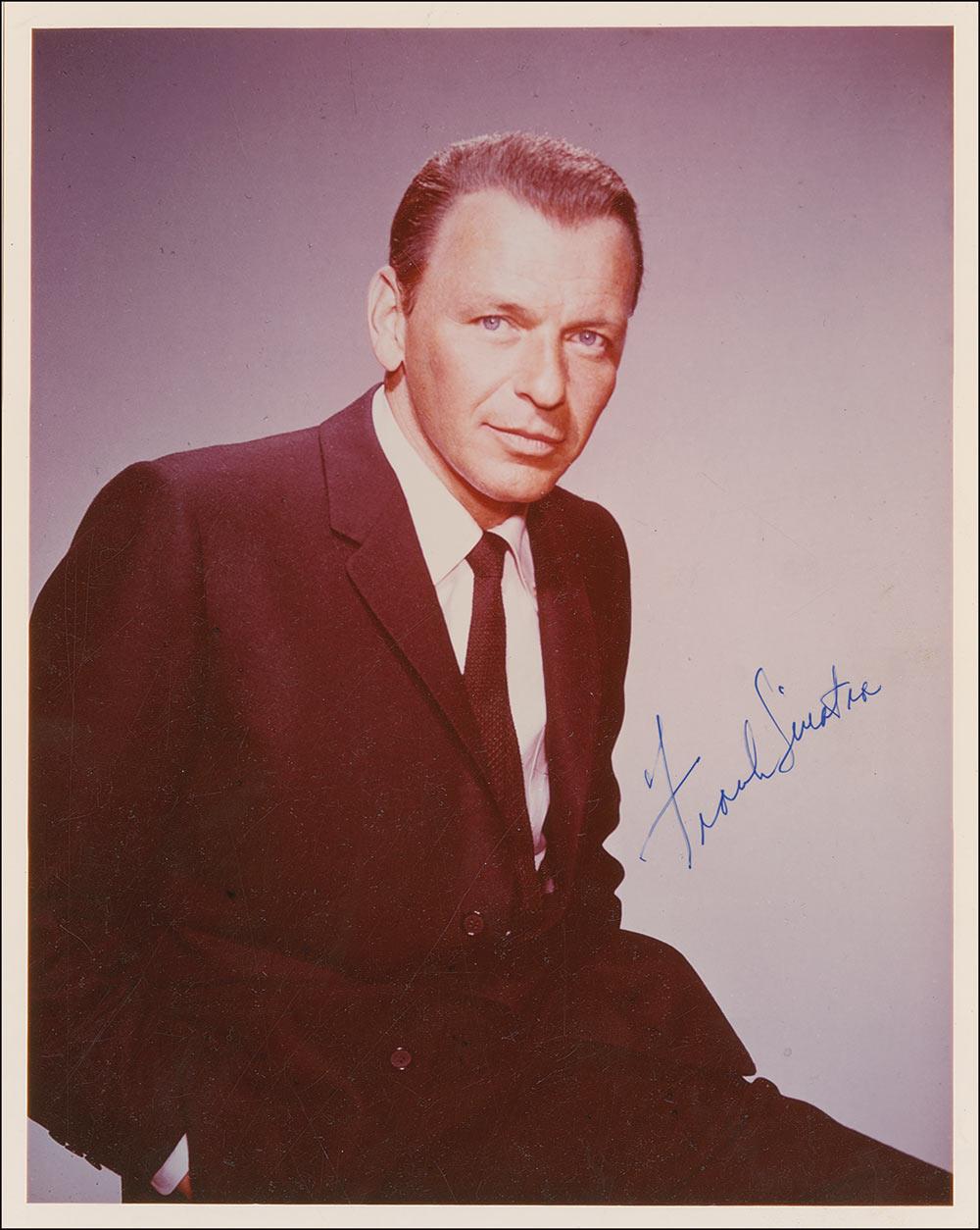 Glossy 8 x 10 casual photo of Sinatra in a suit, his hands stuffed in his pockets, signed in-person in blue felt tip. In fine condition, with a few scattered light surface marks. Originally obtained by noted collector Mike Wehrmann. A highly desirable example of the Chairman of the Board.