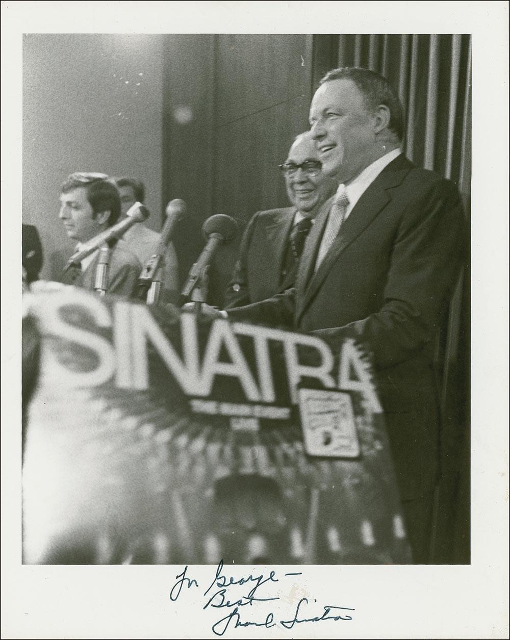 Glossy 8 x 10 photo of Sinatra in front of a podium, signed and inscribed in the lower border in black felt tip “For George-Best, Frank Sinatra.” Small brush to sentiment, small area of staining above signature, and some scattered light creases and surface marks, otherwise fine condition.