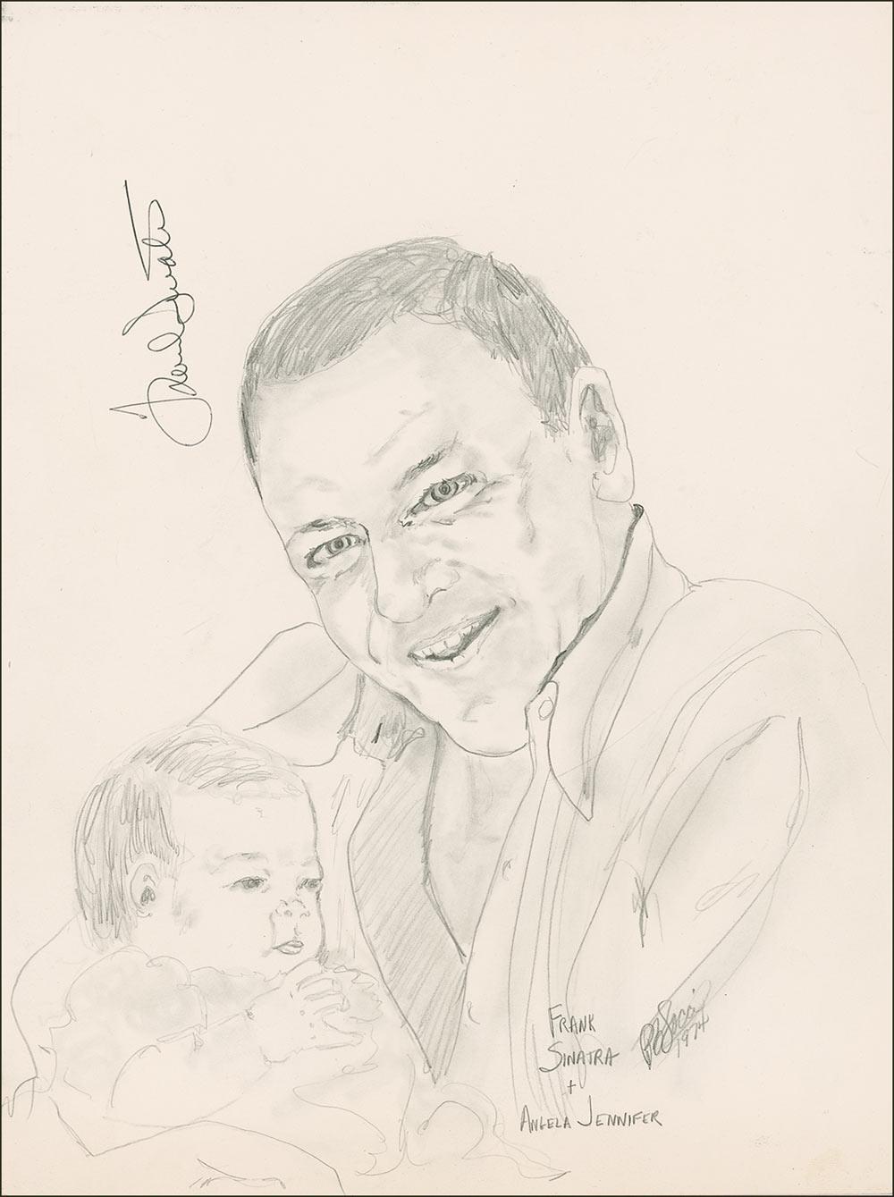 Original pencil sketch of Sinatra holding his granddaughter Angela, done in an admirer’s hand, on an off-white 9 x 12 sheet, signed vertically in black ink by Sinatra. In fine condition.