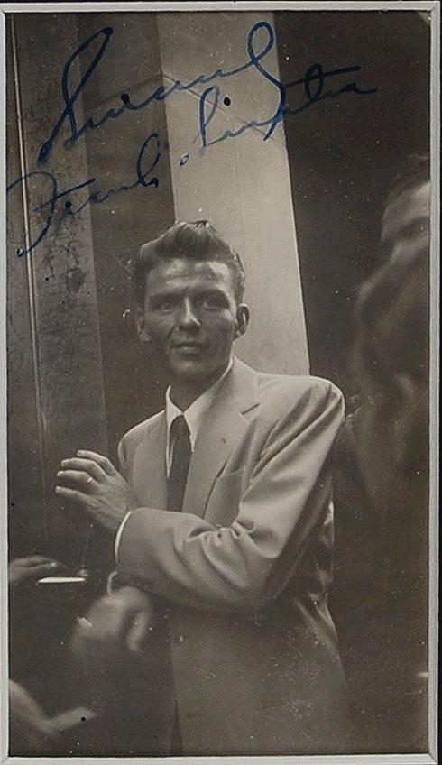 Vintage glossy 2.25 x 4 candid photo of a youthful Sinatra, signed in fountain pen “Sincerely, Frank Sinatra.” In fine condition, with a couple of surface marks and faint creases with slightly heavier creasing touching the first letter of his name.