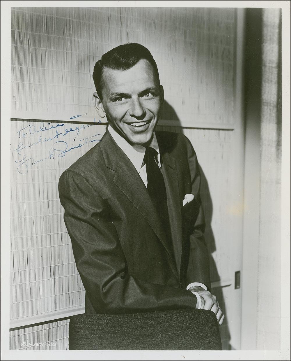 Vintage glossy 8 x 10 photo, signed and inscribed in fountain pen “To Alice—fondest regards, Frank Sinatra.” In very good condition, with scattered light creases and surface marks, and light overall irregular adhesion to signature and inscription. Alice was one of the head switchboard operators at Warner Brothers in the 1940s.