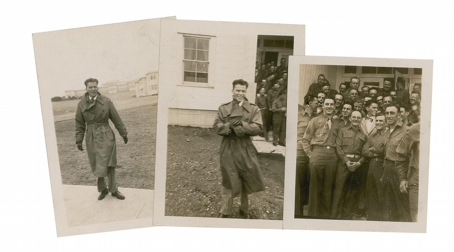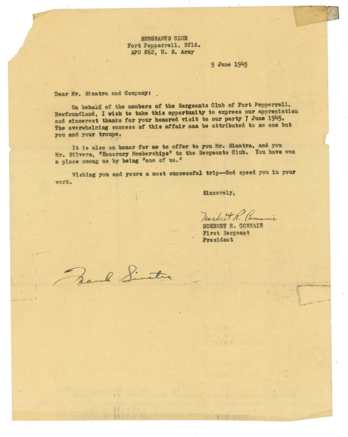 Vintage fountain pen signature, “Frank Sinatra,” at the bottom of a June 9, 1945, TLS to Sinatra, signed by Norbert Connair, president of the Sergeants Club, one onionskin page, 8 x 10. Letter reads, in part: “On behalf of the members of the Sergeants Club of Fort Pepperrell, Newfoundland, I wish to take this opportunity to express our appreciation and sincerest thanks for your honored visit…It is also an honor for me to offer to you Mr. Sinatra, and you Mr. Silvers, ‘Honorary Memberships’ to the Sergeants Club. You have won a place among us by being ‘one of us.’” In very good condition, with intersecting folds, one directly under signature, scattered creases and wrinkles, paper loss to edges, and small area of toning and tape remnant to right edge. Accompanied by three candid snapshots of Sinatra’s visit to the base.