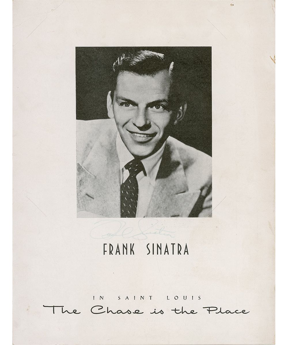 Chase Club menu, 10.75 x 14, featuring a photo of Sinatra on the back cover, promoting his performance in St. Louis at the Chase, signed under his image in fountain pen. In very good condition, with scattered light toning and creasing, a couple of small edge tears, and the signature a shade or two light, but completely legible.