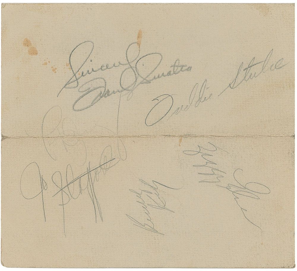 Cocktail menu from the Hotel Astor, 7.75 x 7, signed on the back cover in pencil, “Sincerely, Frank Sinatra.” Reverse is also signed by Jo Stafford, Ziggy Elman, Freddie Stulce, and Beverly Kily, and one other. A central horizontal fold, not affecting Sinatra’s signature, scattered mild toning and soiling, with a bit lightly affecting Sinatra’s sentiment, otherwise fine condition.