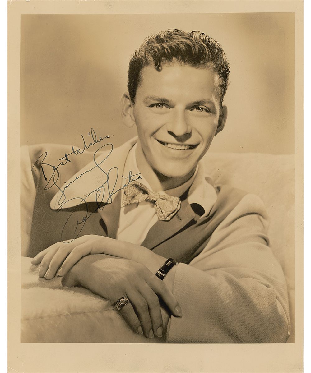 Desirable vintage glossy 8 x 10 publicity photo of a young Sinatra, signed in fountain pen, “Best wishes, Sincerely, Frank Sinatra.” In very good condition, with scattered creases, crazing to the emulsion, and light rippling to the top edge. Original collector’s pencil notation on the reverse indicates that she received the photo from his manager and had Sinatra sign it when she met him backstage at Philadelphia’s Earle Theatre in December 1943. Sinatra had just signed with Columbia Records in June of that year, beginning what would become a wildly successful solo career. A beautifully signed early image that displays extremely well.