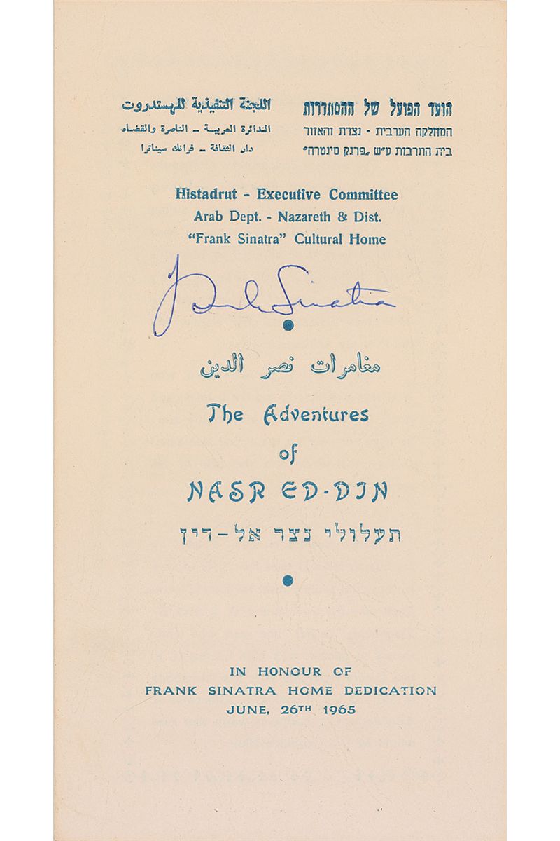 Program for a performance of The Adventures of Nasr Ed-Din from the opening of the Frank Sinatra Cultural Home in Israel, June 26, 1965, 5 x 9, three pages, signed on the front cover in blue ballpoint by Sinatra. In fine condition.