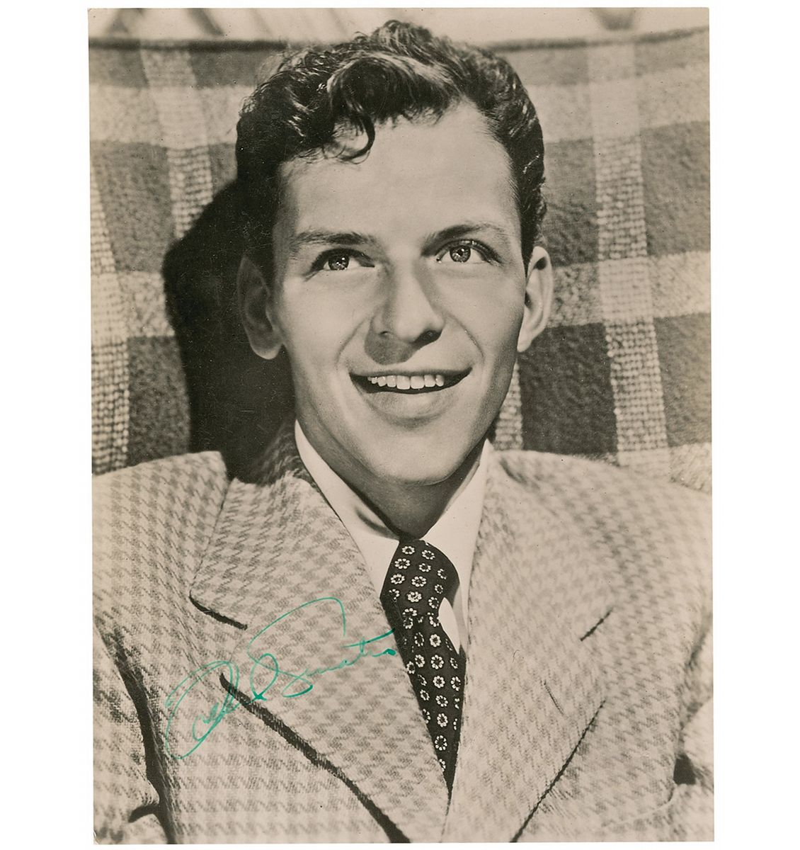 Fantastic vintage glossy 6 x 8 photo of a young Sinatra wearing a sport coat and tie, signed in green fountain pen. In fine condition, with a few trivial scattered surface marks.