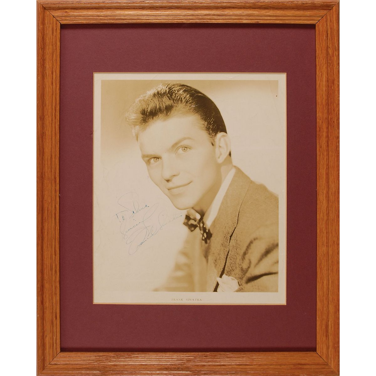 Vintage glossy 8 x 10 head-and-shoulders publicity photo of a young Sinatra in a jacket and bow tie, signed and inscribed in fountain pen “To Salina, Sincerely, Frank Sinatra.” Matted and framed (without glass) to an overall size of 12.5 x 16. Light overall creasing and surface marks, otherwise very good condition.