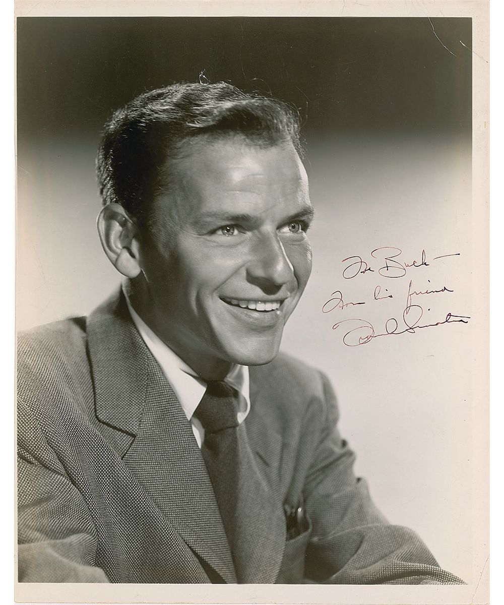 Superb vintage glossy 7.75 x 10 MGM publicity portrait of Sinatra by Clarence Sinclair Bull, signed and inscribed in fountain pen, “For Buck—From his friend, Frank Sinatra.” Reverse bears an MGM ink stamp and note that says the recipient received the photo after appearing on a Sinatra show sponsored by Bulova. In very good condition, with scattered surface creases (heavier to corners and borders), an inconspicuous puncture above his head, and a lightly trimmed left edge. A handsome image signed thoughtfully and prominently against the white background.