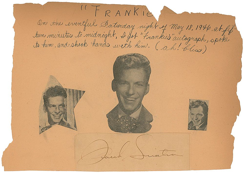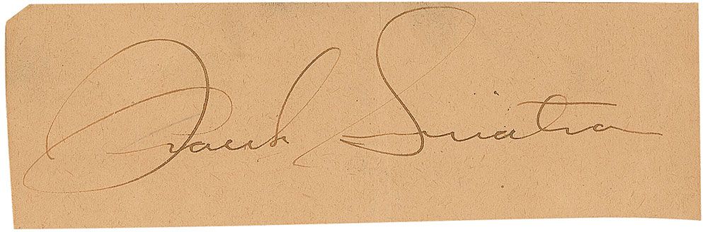 Outstanding vintage fountain pen signature, “Frank Sinatra,” on an off-white 5 x 1.75 slip, affixed to a 10.75 x 8 scrapbook page which bears a collector’s notation indicating that it was signed on May 18, 1946. In fine condition.