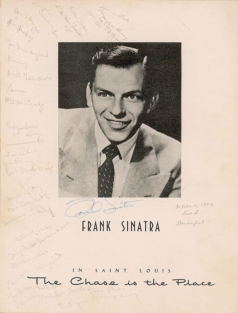 Menu for the Chase Club in St. Louis featuring a portrait of Sinatra on the reverse, 10.5 x 14, nicely signed below his image in blue ballpoint. Collector’s pencil notations to the borders indicate a date of October 6, 1952, and provide a set list from Sinatra’s performance that night, which included ‘Old Black Magic,’ ‘Night & Day,’ and ‘All of Me.’ Scattered creases (none affecting the image or signature), otherwise fine condition.