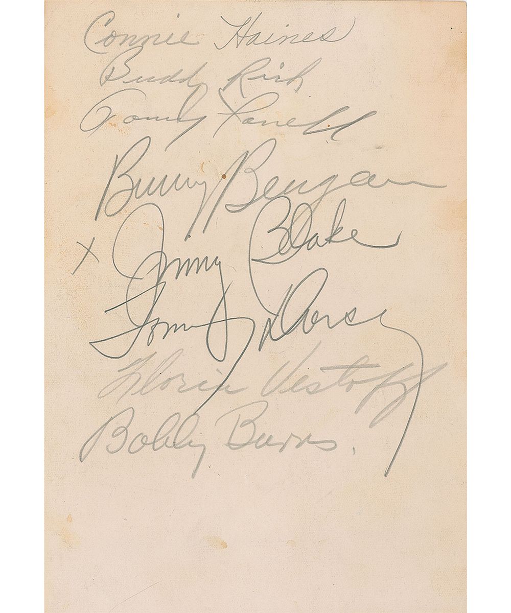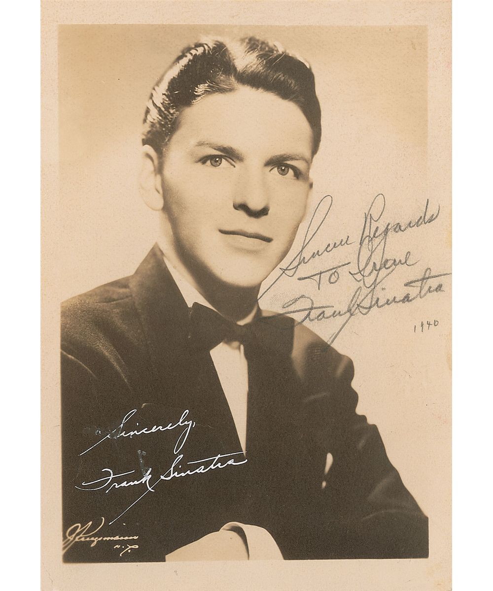 Vintage matte-finish 5 x 7 photo of a young Sinatra in a tuxedo, signed and inscribed in pencil, “Sincere regards to Irene, Frank Sinatra,” and dated underneath 1940 in another hand. Front of the photo also bears a white ink secretarial signature. The reverse is signed in pencil by eight other big band artists including Tommy Dorsey, Buddy Rich, Connie Haines, Bunny Berigan, Jimmy Blake, and Bobby Burns. A few light creases, a bit of scattered soiling around Sinatra’s signature and inscription, and some light toning to reverse, otherwise fine condition.