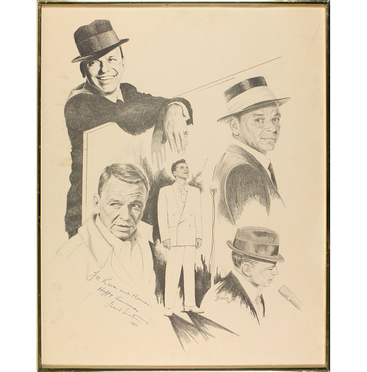 Nice print of an artist’s rendition of Sinatra in various poses, 17.5 x 23.25, signed and inscribed in blue ink, “For Reva and Herman—Happy Anniversary, Frank Sinatra, 1980.” Framed to an overall size of 18.5 x 24.5. Some scattered marks and soiling, otherwise fine condition. Oversized.