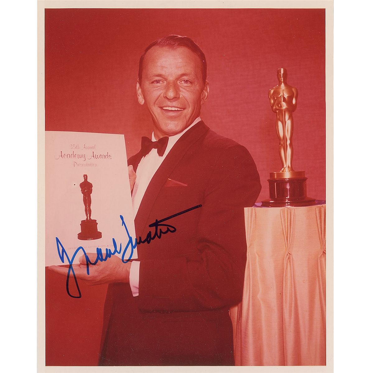 Color glossy 8 x 10 photo of Sinatra posing with an Oscar statue and program for the 35th Annual Academy Awards, signed in person in blue felt tip. In very fine condition. Originally obtained by in-person specialist Mike Wehrmann. Sinatra served as host for the awards, held on April 8, 1963.