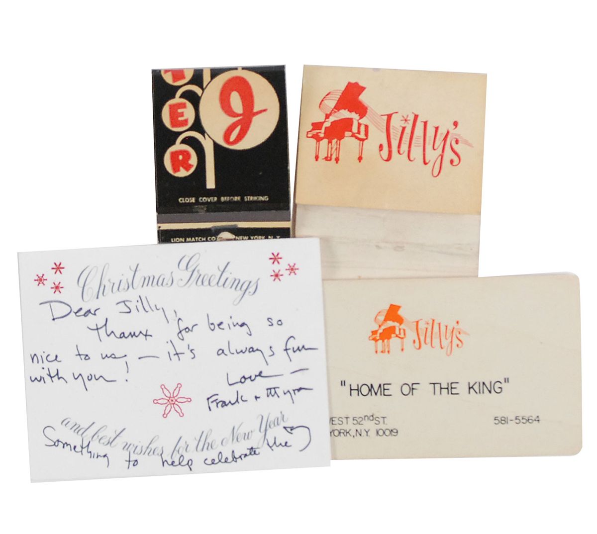 Collection of four items: an empty matchbook from Jilly’s on West 52nd Street in New York, with a printed testimonial from Sinatra on the inside cover; a full matchbook from Mister J’s; a 3.5 x 2 business card from Jilly’s; and a 3.5 x 2.5 Christmas tag, with a note to Jilly’s from “Frank & Myron,” written in an unknown hand. In very good to fine condition. Provenance: The John Strangi Collection.
