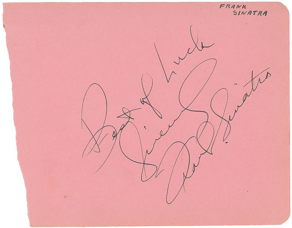Vintage fountain pen signature, “Best of luck, Sincerely, Frank Sinatra,” on a light pink 5.5 x 4.5 album page with a small collector’s notation along top edge. In fine condition.