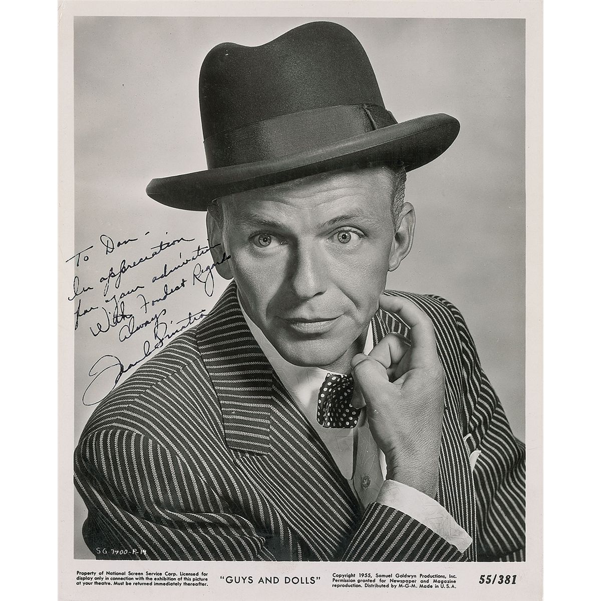 Vintage glossy 8 x 10 MGM promotional photo for Guys and Dolls, signed and inscribed in fountain pen, “To Dan—In appreciation for your admiration. With fondest regards always, Frank Sinatra.” In fine condition, with some scattered light bends and creases, and a few spots to finish to lower left. A handsome portrait from Sinatra’s resurgence as the image practically leaps off the photo.