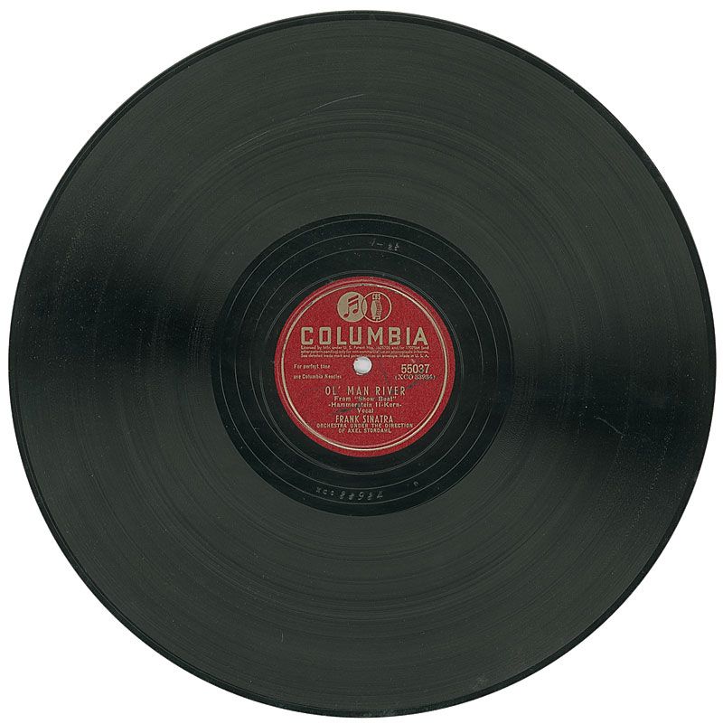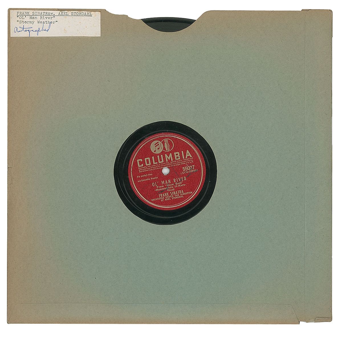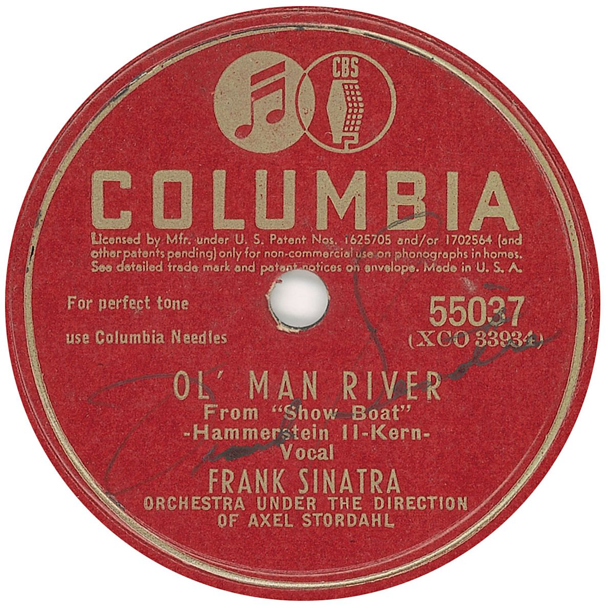 Columbia’s Ol’ Man River / Stormy Weather phonograph record signed on the Ol’ Man River label in fountain pen circa 1947. In fine condition, with some light overall contrast to signature.