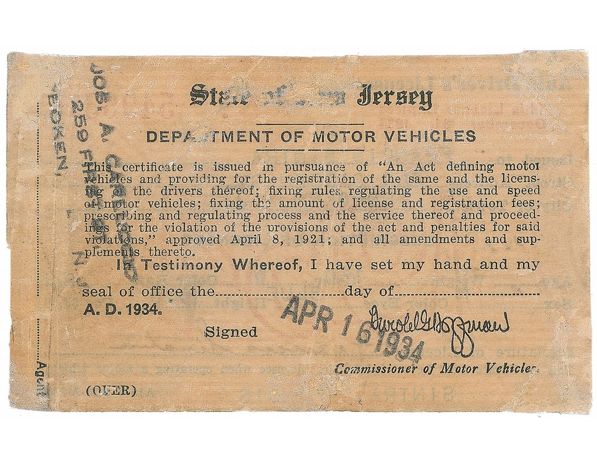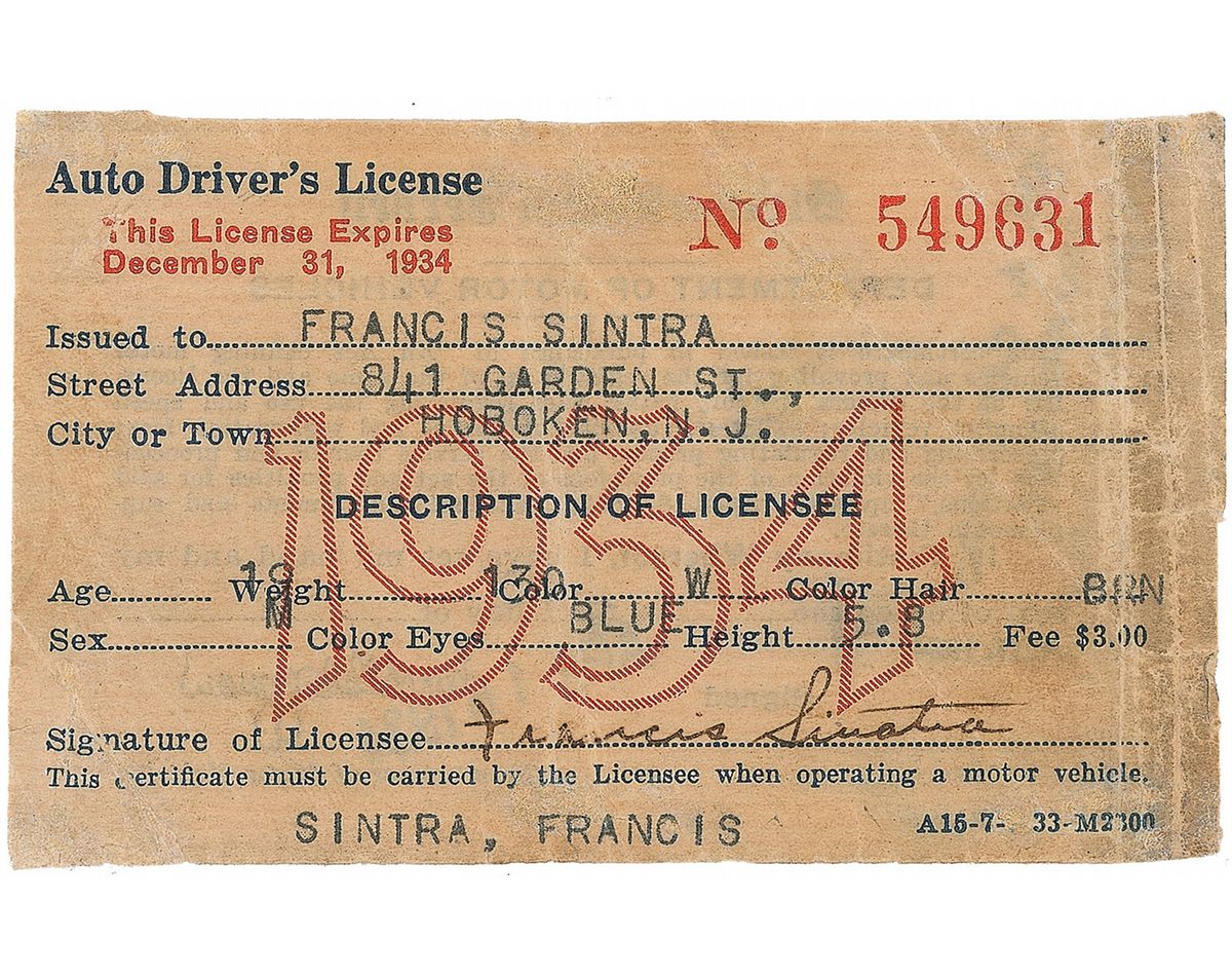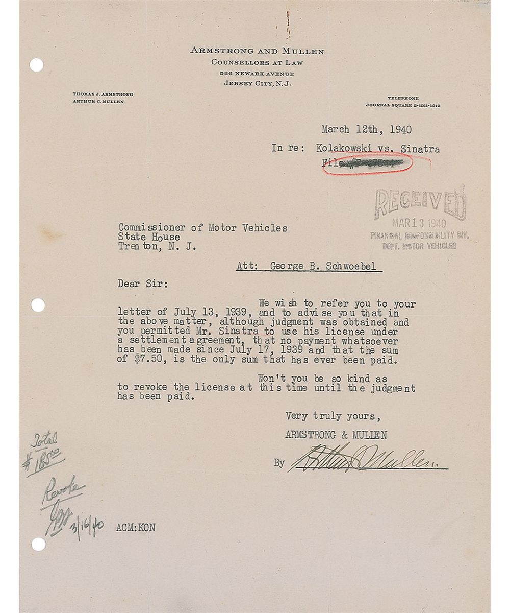 Sinatra’s first New Jersey’s driver’s license, number 549631, 4 x 2.25, stamp-dated on the reverse, April 16, 1934, and signed at the bottom, “Francis Sinatra.” License lists Sinatra’s name, Hoboken address, his age, “19,” and his physical description, with a red “1934” printed in the center. Accompanied by a March 12, 1940, TLS from attorney Arthur Mullen to the New Jersey Commissioner of Motor Vehicles, concerning the case of “Kolakowski vs. Sinatra.” Letter reads, in full: “We wish to refer you to your letter of July 13, 1939, and to advise you that in the above matter, although judgement was obtained and you permitted Mr. Sinatra to use his license under a settlement agreement, that no payment whatsoever has been made since July 17, 1939 and that the sum of $7.50, is the only sum that has ever been paid. Won’t you be so kind as to revoke the license at this time until the judgement has been paid.” Traced over pencil notation to lower left of letter reads, “Total $165.00, Revoke GBS 3/16/40.” Expected soiling and scattered creasing to license, with a couple passing through single letters of Sinatra’s signature, repaired staple hole, and mounting remnants to reverse, otherwise fine condition. An extremely early and scarce format, issued at the age of only 19 years old, a year before getting his first break in the music industry, winning a six-month performance contract after appearing on the Major Bowes Amateur Hour.