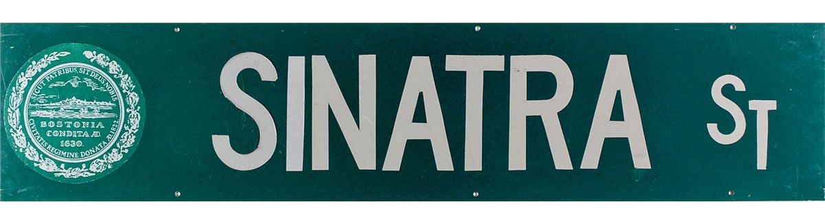 Official city of Boston bright green “Sinatra St.” double-sided street sign, 36 x 8, made by the Department of Public Works, and hung on one of the corners of Mass Ave. and Huntington Ave. or Mass Ave. and Symphony Road, all streets that abut Boston’s Symphony Hall. These signs were hung in honor of Frank Sinatra Day in Boston, held in April of 1987, by order of Mayor Ray Flynn. Flynn declared Massachusetts Avenue as Sinatra Street for the evening, before his concert at Symphony Hall as a benefit for Flynn’s Youth Partnership. After his show, the signs were removed and presented as thank-you gifts for those who worked on the concert, with this sign presented to the Entertainment Network, who booked Sinatra for the show, and also ran the Channel nightclub in Boston. This sign hung at the nightclub for several years until it closed. In fine condition, with six mounting holes to edges and some scattered light surface marks.
