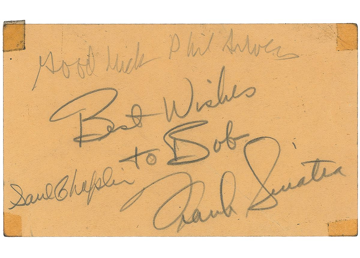 Vintage pencil signature and inscription, “Best wishes to Bob, Frank Sinatra,” on an off-white 5 x 3 card, also signed by Phil Silvers and Saul Chaplin. In very good condition, with a light diagonal crease, uniform overall toning, and toned tape to corners.