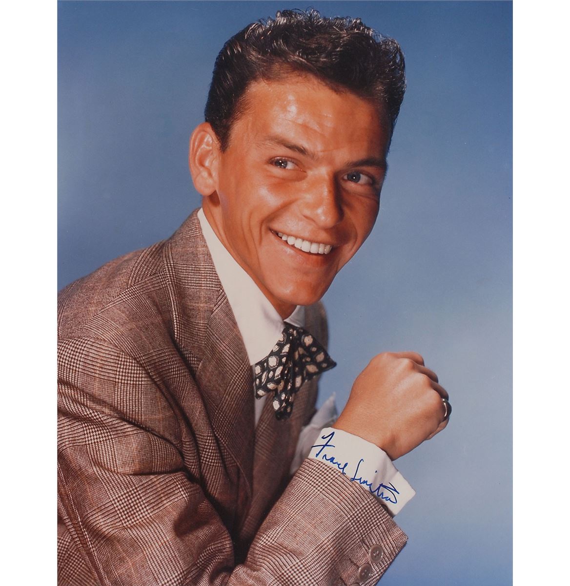 Exceptional color glossy 10.5 x 13.25 photo of Sinatra, signed on his cuff in blue felt tip. Double-matted and framed to an overall size of 18 x 20.75. In fine condition. Accompanied by a letter of provenance from a friend of the original recipient, in full: “This photo was signed in Atlantic City, NJ by Sinatra for my friend Don Hurley, an A. C. police officer who worked P/T for Sinatra as a bodyguard when Sinatra visited. The photo was signed in Don’s presence.”