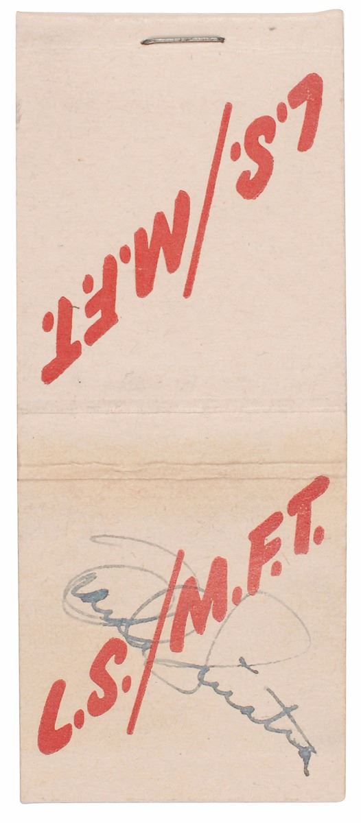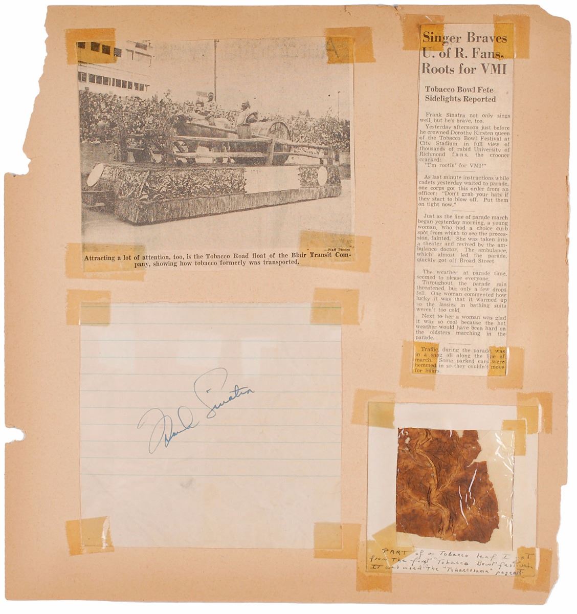 Desirable pair of vintage 1949 fountain pen signatures, “Frank Sinatra,” one on a lightly lined 5.5 x 5.25 sheet and the other on a 1.5 x 3.75 Lucky Strike matchbook. The sheet is affixed to a larger scrapbook page along with a few newspaper clippings and a tobacco leaf collected as a souvenir from the ‘Tobacco Bowl Festival’ at which these were signed. Overall creasing, light toning, and toned tape to corners of the lined sheet, otherwise overall fine condition. Accompanied by a letter of provenance from the original recipient, noting that Sinatra was invited to the 1949 Tobacco Bowl Festival as a grand marshal and signed these at a nearby department store.