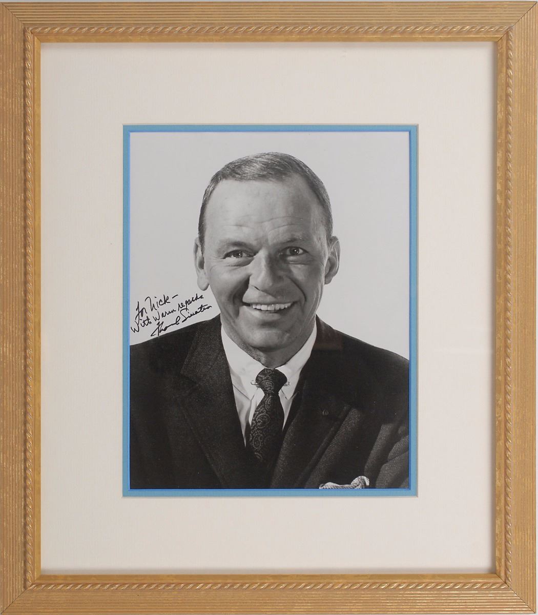 Semi-glossy 7.25 x 9.25 photo of Sinatra, signed and inscribed in black felt tip, “For Nick—With warm regards, Frank Sinatra.” Double-matted and framed to an overall size of 14 x 16. In fine condition.