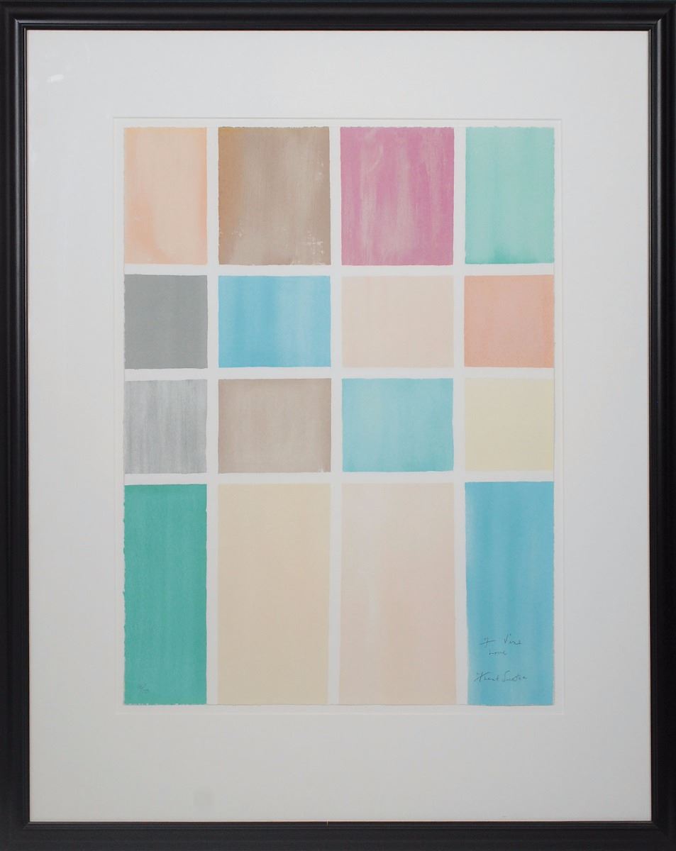 Abstract color limited edition 19 x 26 lithograph of soft-colored squares, numbered 65/150, signed and inscribed in the lower right in pencil, “To Vine, Frank Sinatra.” Handsomely mounted, matted, and framed to an overall size of 31 x 38. In fine condition, with some scattered surface creases. Elvina Joubert—or Vine, as she was commonly known—was Sinatra’s friend and housekeeper for nearly 40 years. Oversized.