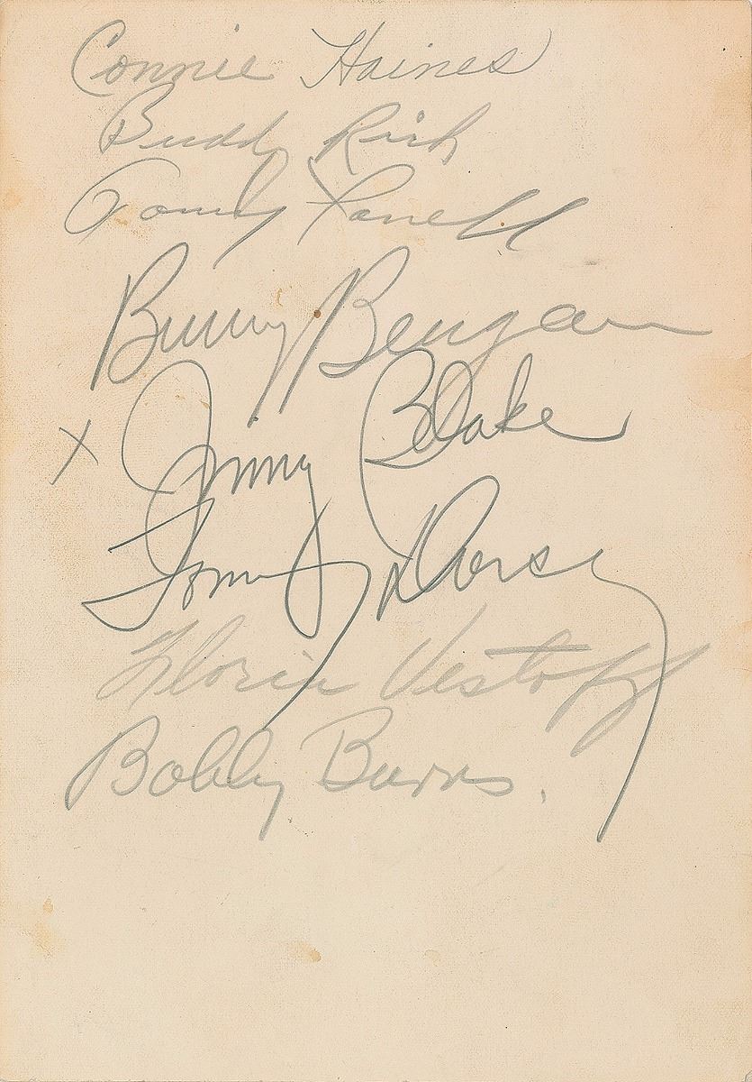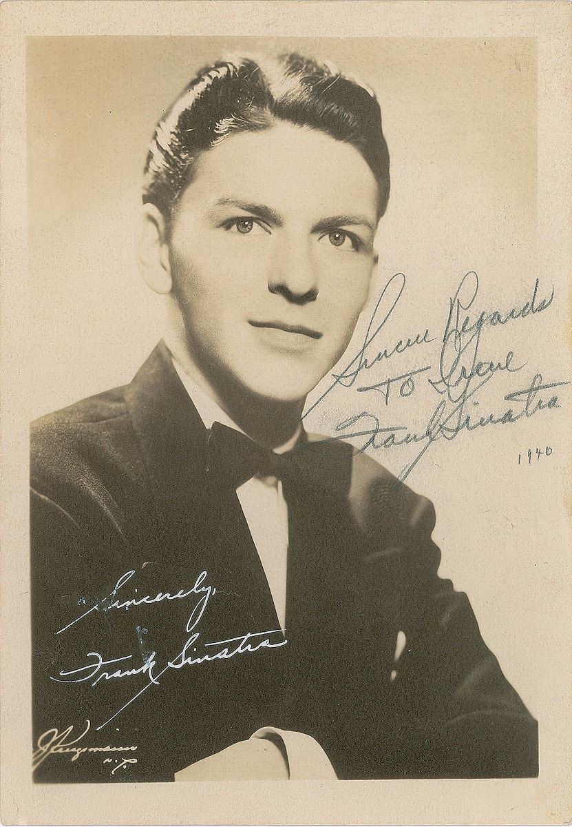 Vintage matte-finish 5 x 7 photo of a young Sinatra in a tuxedo, signed and inscribed in pencil, “Sincere regards to Irene, Frank Sinatra,” dated 1940 in another hand. Front of the photo also bears a white ink secretarial signature. Signed on the reverse in pencil by eight other big band artists including Tommy Dorsey, Buddy Rich, Connie Haines, Bunny Berigan, Jimmy Blake, and Bobby Burns. In fine condition, with a slight creases.