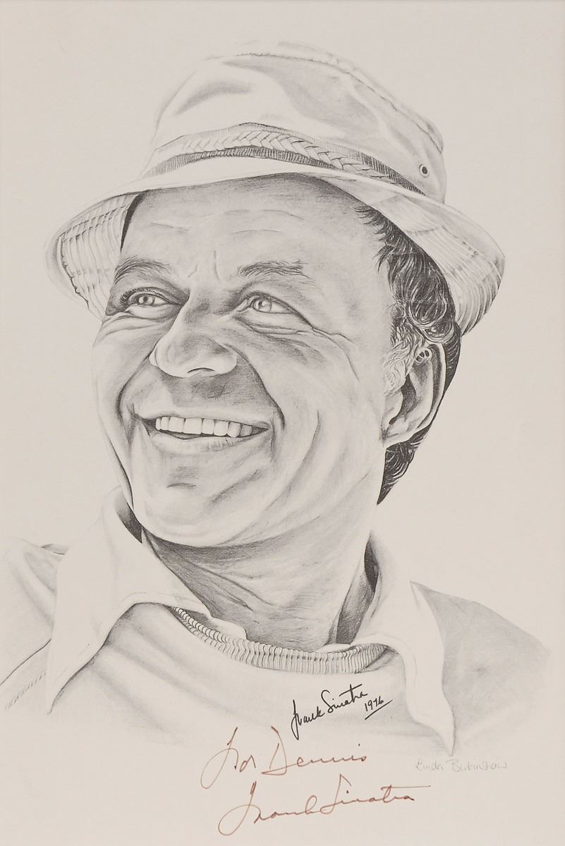 An 8 x 11.75 printed sketch of Sinatra wearing a hat, signed and inscribed in brown felt tip to his driver Dennis Parker, “For Dennis—Frank Sinatra.” A printed secretarial signature is also inherent to the print. Matted and in fine condition. Parker was Sinatra’s driver during his tours of Britain and Europe for twenty-five years, becoming one of the singer’s close friends.