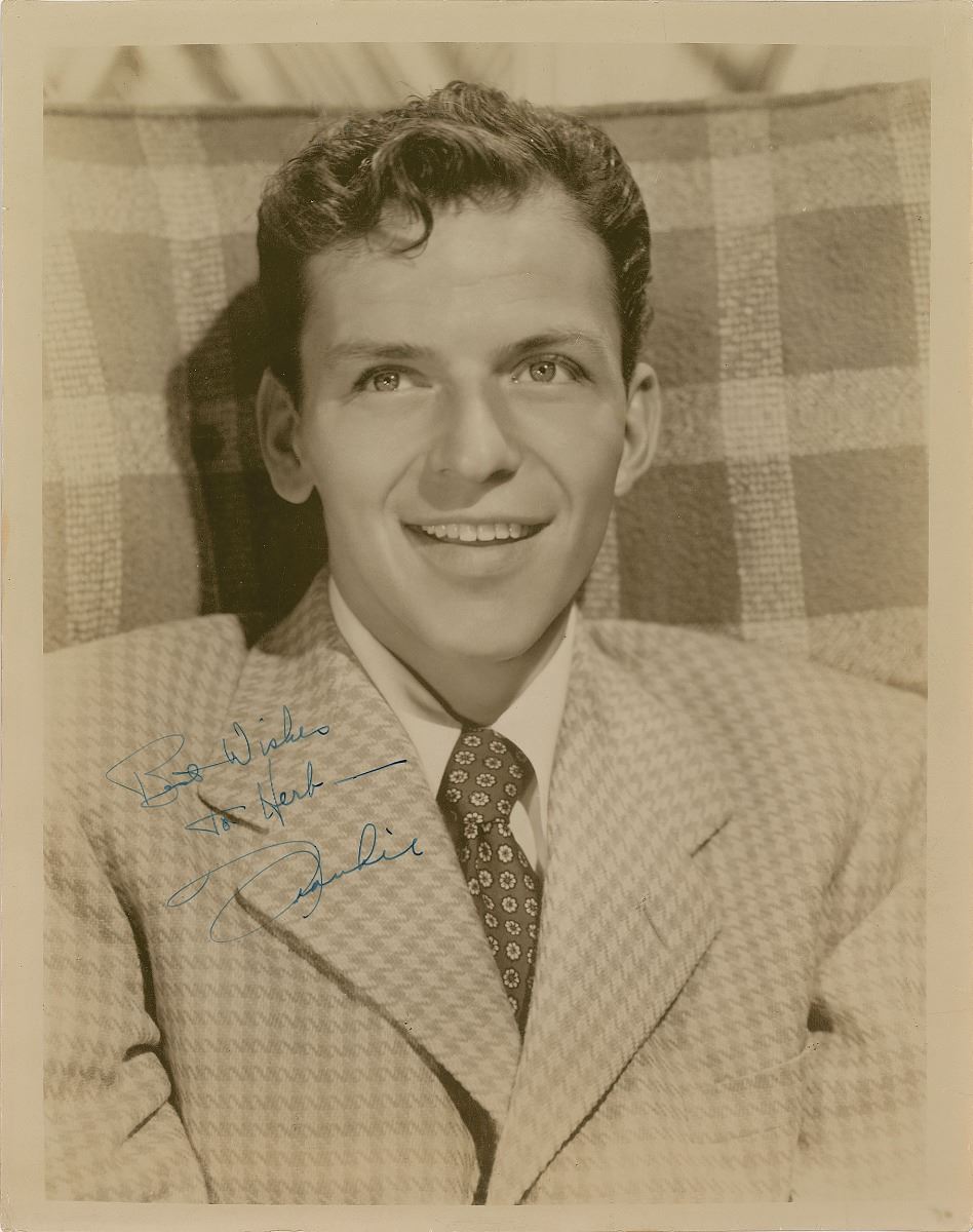 Vintage glossy 8 x 10.25 photo of a young Sinatra in a suit and tie, signed and inscribed in blue ink, “Best Wishes for Herb—Frankie.” In very good to fine condition, with scattered creasing (predominately to the facial area) and surface impressions from an item written on top of the photo at some point.