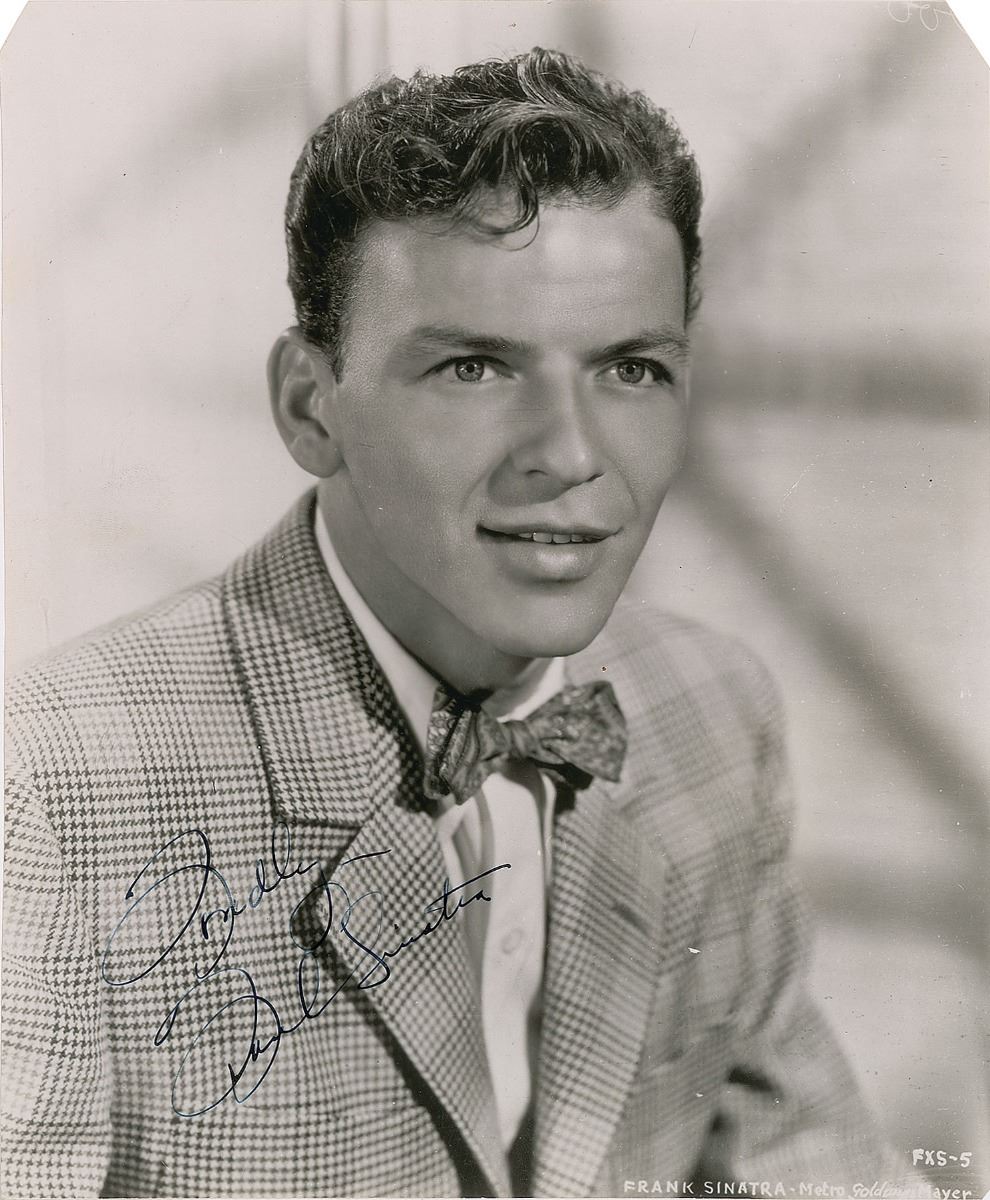 Wonderful vintage glossy 7.5 x 9.25 MGM publicity portrait of the young crooner wearing a bow tie and plaid suit, signed in fountain pen, “Fondly—Frank Sinatra.” In very good to fine condition, with scattered light creasing, trimmed edges, and clipped corners. Accompanied by a full letter of authenticity from JSA. A highly appealing uninscribed example.