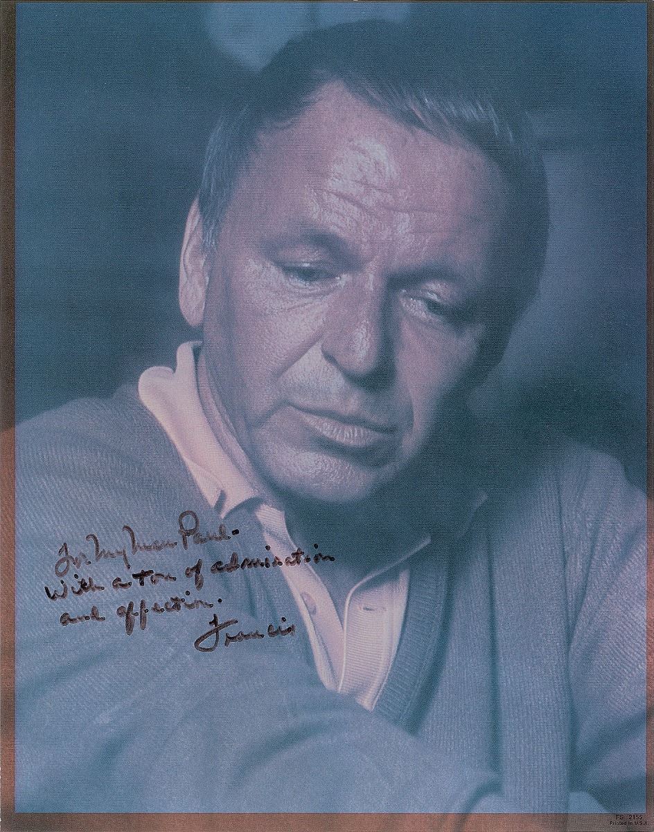 Color textured 9.25 x 11.75 cardstock photo of Sinatra in a thoughtful head-and-shoulders pose, signed and inscribed in black felt tip, "For my man Paul—with a ton of admiration and affection, Francis.” In fine condition, with a block of light uniform fading from prior display. Pre-certified PSA/DNA.