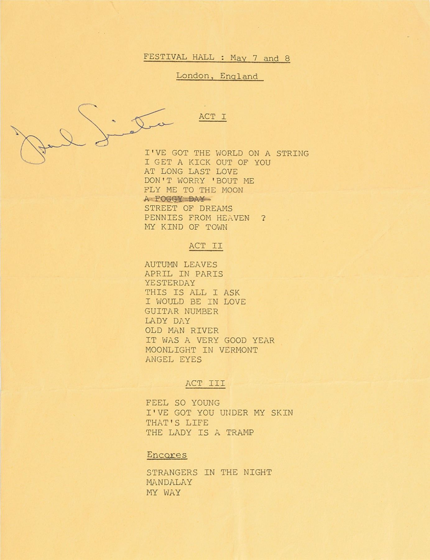 Uncommon set list for a two-night concert at London's Royal Festival Hall on May 7 and 8, 1970, one page, 8 x 10, signed in black ballpoint by Sinatra. The sheet consists of three acts and one encore, and includes classic songs like 'My Way,' 'Fly Me to the Moon,' and 'The Lady Is a Tramp.' In fine condition. Accompanied by a letter related to the concerts, dated April 13, 1970, and the original mailing envelope.