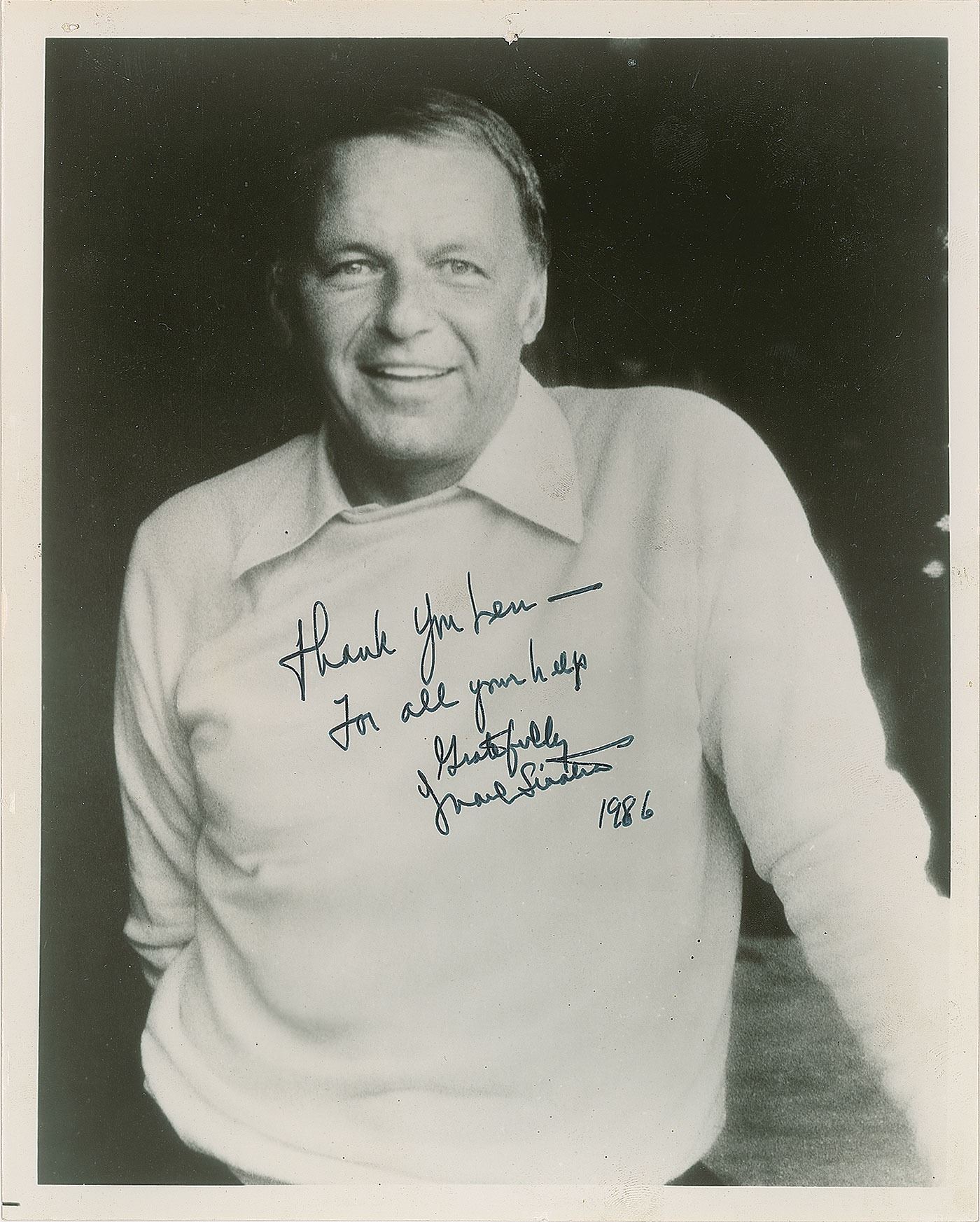 Glossy 8 x 10 photo of Sinatra in a charming half-length pose, signed and inscribed in thin black felt tip, "Thank you Len—For all your help, Gratefully, Frank Sinatra, 1986.” In fine condition, with three tack holes to the top.