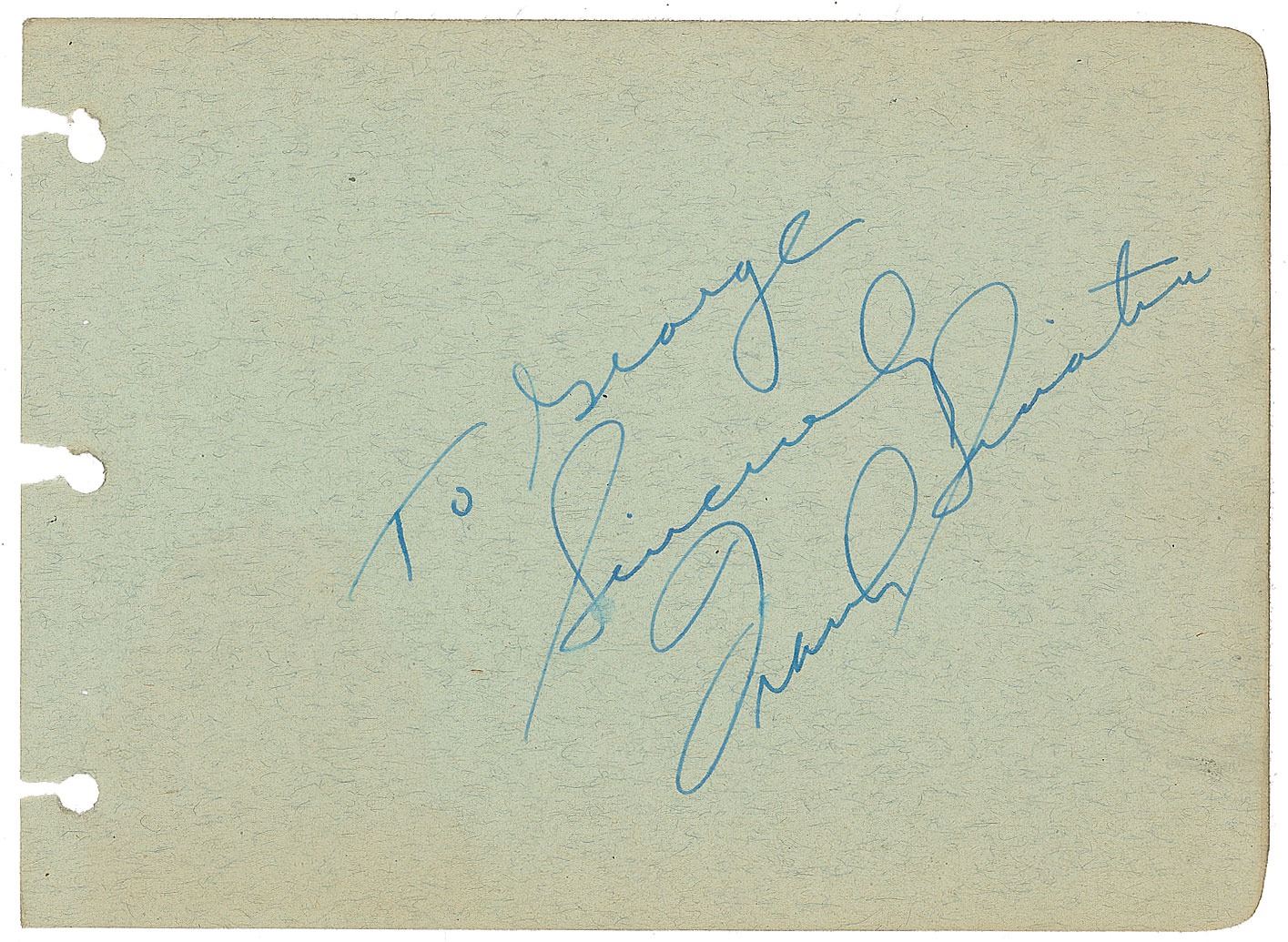 Vintage fountain pen signature and inscription, "To George, Sincerely, Frank Sinatra,” on a light green 6 x 4.25 album page. In fine condition, with a small spot to the "S" in the inscription.