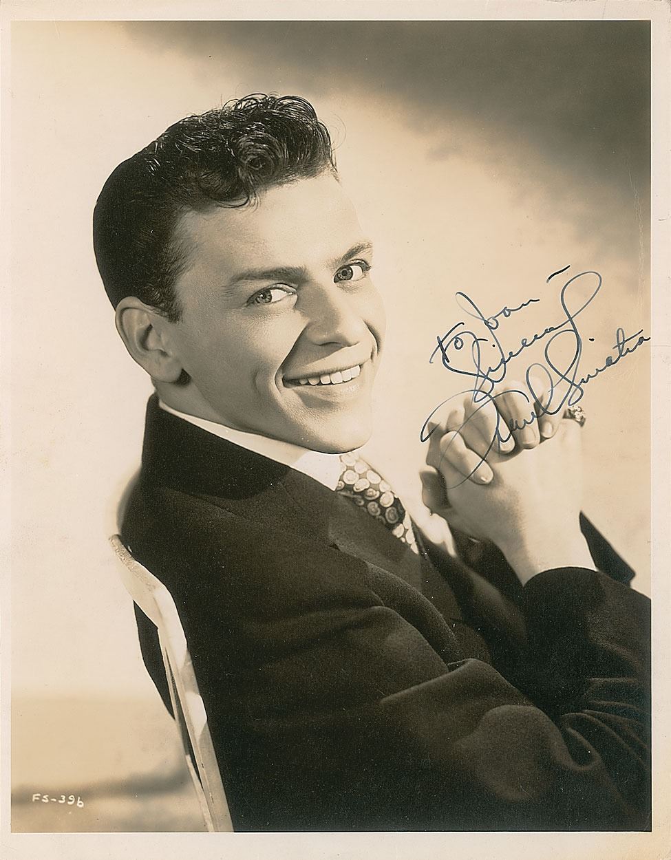 Vintage matte-finish 7.75 x 10 photo of the handsome young crooner seated in a chair, signed and inscribed in fountain pen, "To Joan—Sincerely, Frank Sinatra.” In fine condition, with a slightly trimmed left edge, some faint silvering, and a couple of creases to the right side.