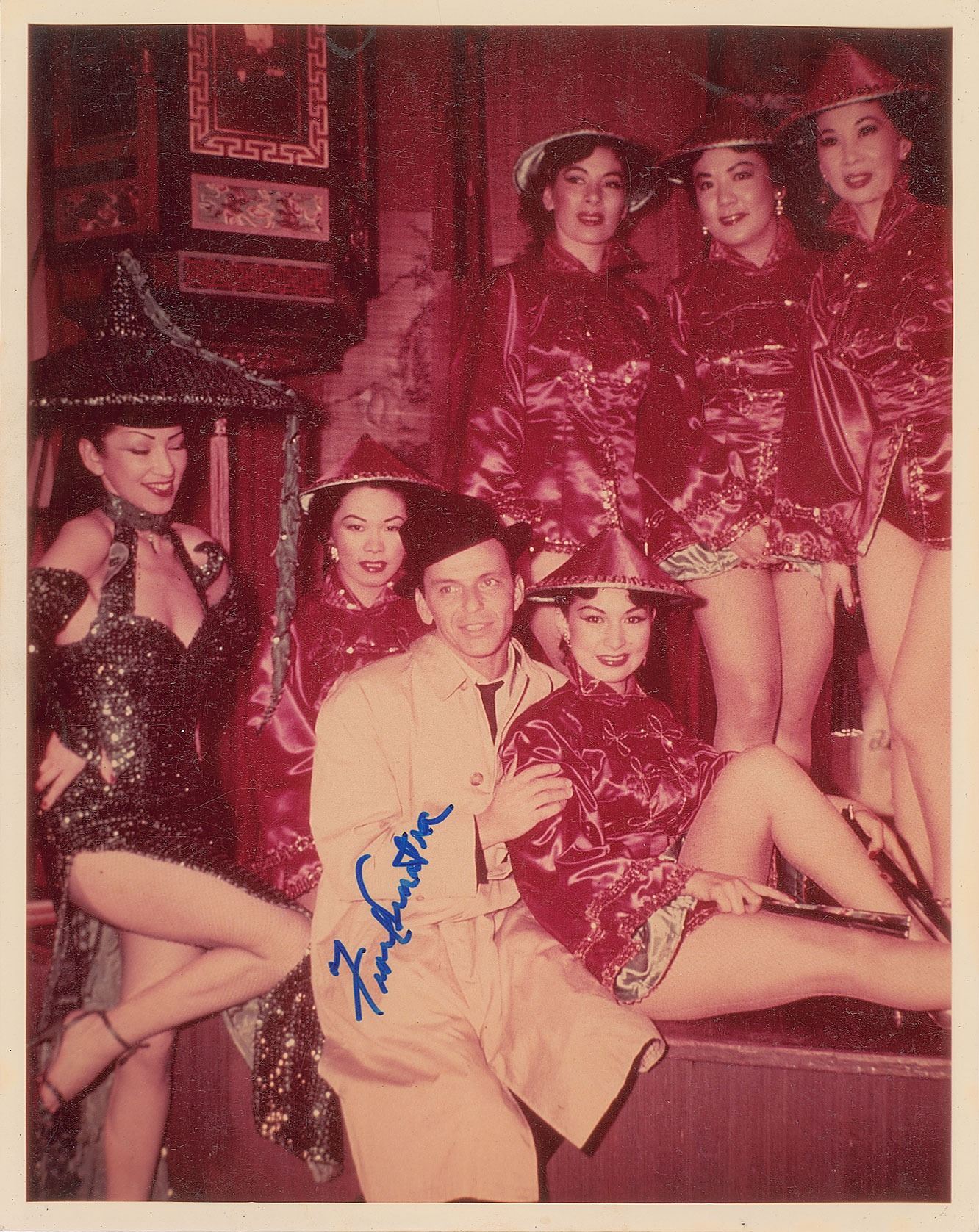Color glossy 8 x 10 photo of Frank Sinatra posing alongside several Chinese women, signed in blue felt tip. In very good to fine condition, with light scuffing, and a few small surface creases. Originally obtained by in-person specialist Mike Wehrmann.