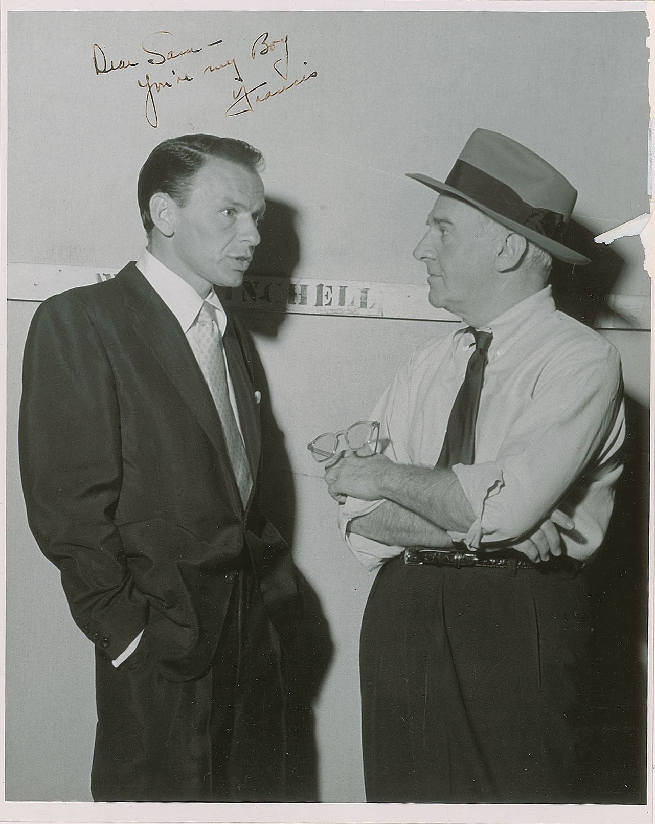 Vintage glossy 8 x 10 photo of Sinatra standing and speaking with columnist Walter Winchell, signed and inscribed in fountain pen, "Dear Sam—You're my Boy, Frank Sinatra.” Reverse bears a Bill Mark credit stamp. In very good to fine condition, with trimmed edges, and an emulsion tear to the right edge.