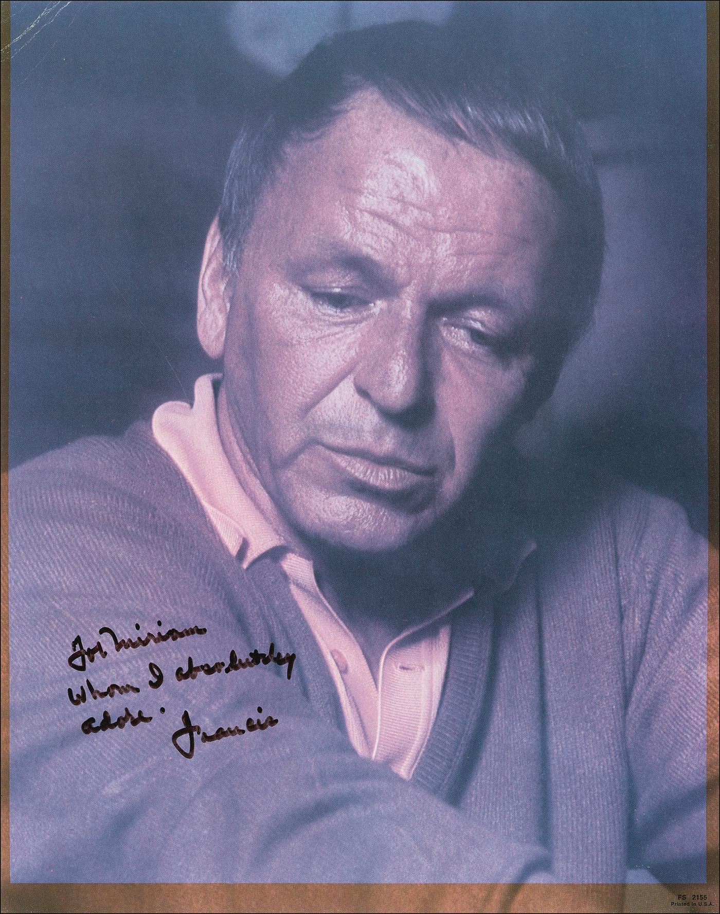 Color 9.25 x 11.75 cardstock photo, signed and inscribed in black felt tip to producer Paul Keyes’ wife, “For Miriam, Whom I absolutely adore. Francis.” In fine condition. Keyes first met Sinatra when Keyes was a teenager and they formed a life long friendship. Pre-certified PSA/DNA and RRAuction COA.