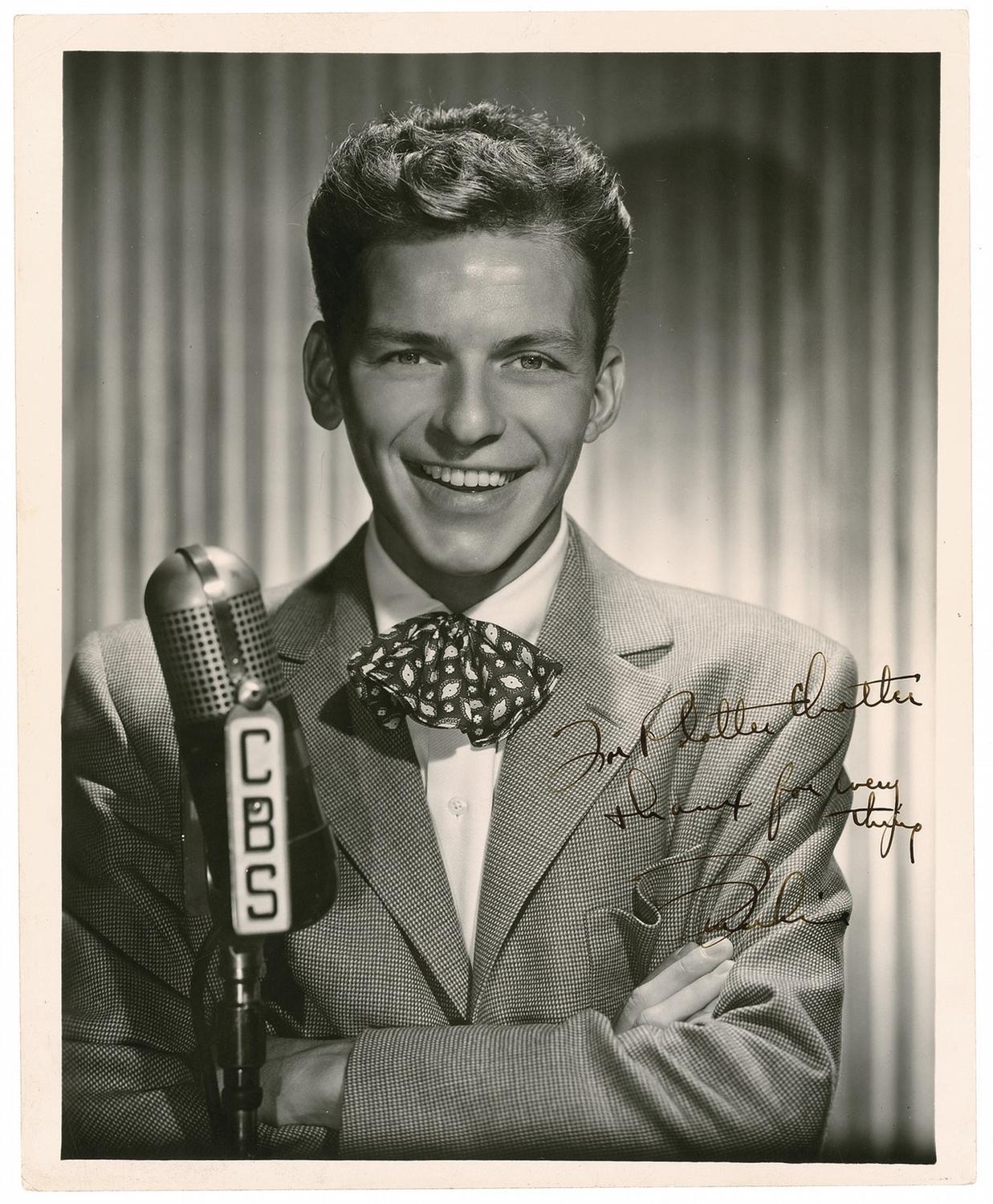 Exceptional vintage glossy 8 x 10 CBS publicity photo, signed and inscribed in fountain pen “For Platter Chatter, thanx for everything, Frankie.” In fine condition, with a few scattered light surface creases and marks. An exceptional photo with an early signature and association with the music business.