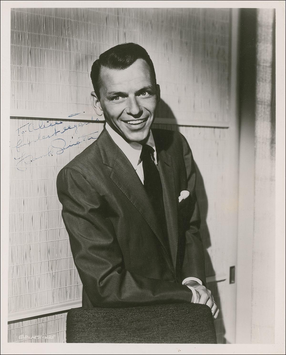 Vintage glossy 8 x 10 photo, signed and inscribed in fountain pen “To Alice—fondest regards, Frank Sinatra.” In very good condition, with scattered light creases and surface marks, and light overall irregular adhesion to signature and inscription. Alice was one of the head switchboard operators at Warner Brothers in the 1940's.