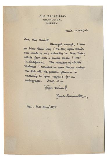 Frank Arthur Swinnerton (1884 – 1982). English novelist, critic, biographer and essayist. ALS. 1 page. On imprinted letterhead. To Mrs. Merritt; "Strangely enough, I was on New Years Day, (the day upon which you wrote to me) actually in New York; while just of a month later I was in California. The memory of all the kindness I received in your State make me fell all the greater pleasure in acceding to your request for an autograph. Here it is, Yours sincerely, Frank Swinnerton". Very Fine.